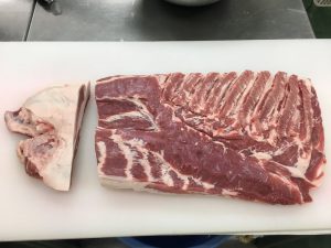 上の写真が原料の能登豚「豚輝」の豚バラ肉の入荷したままの状態です(真空パックを外した状態)。